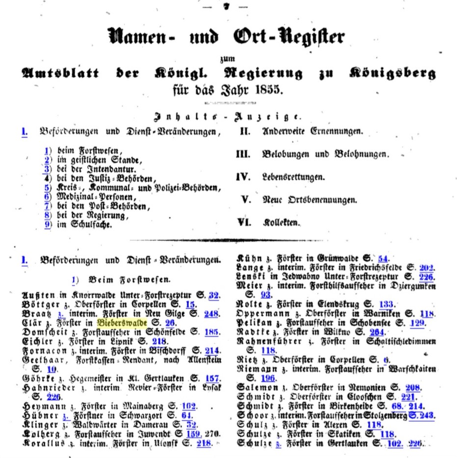 Vor einigen Monaten fand ich, als ich bei Google “Clair Bieberswalde” eingab, im mittlerweile digitalisierten und online verfügbaren Namens- und Ortsregister des Amtsblatts der Königl. Regierung zu Königsberg für das Jahr 1855” den Eintrag: “Clär s. Förster in Bieberswalde S.26”
