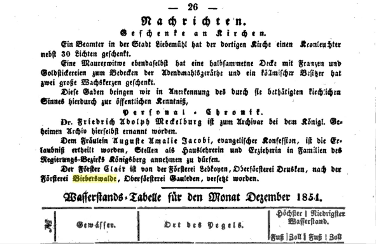 Und auf S.26 dann die Notiz: “Der Förster Clair ist von der Försterei Lebkoyen, Oberförsterei Drusken, nach der Försterei Bieberswalde, Oberförsterei Gauleben, versetzt worden.”