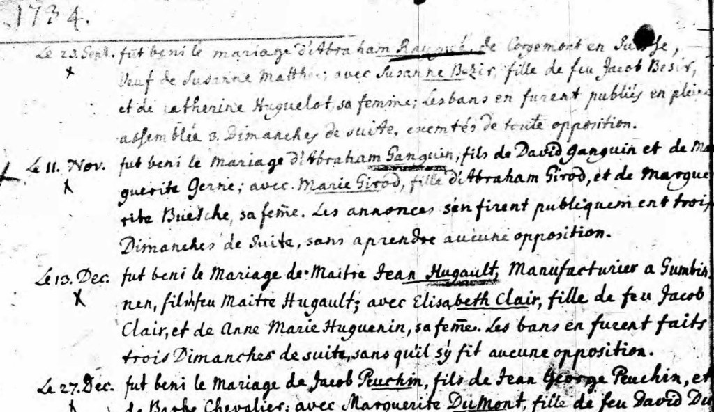 Und noch ein weiterer spektakulärer Fund ist Andreas Z. gelungen. Hier ist der französischsprachige Heiratseintrag von 1734 der Elisabeth Clair, der Tochter des Jacob Clair aus Gumbinnen, der gemeinsam mit David Clair und weiteren Angehörigen 1712 aus St. Imier in der Schweiz neben vielen weiteren französischsprachigen Zuwanderern nach Gumbinnen in die “Schweizer Kolonie” gekommen war, siehe meine früheren Texte.