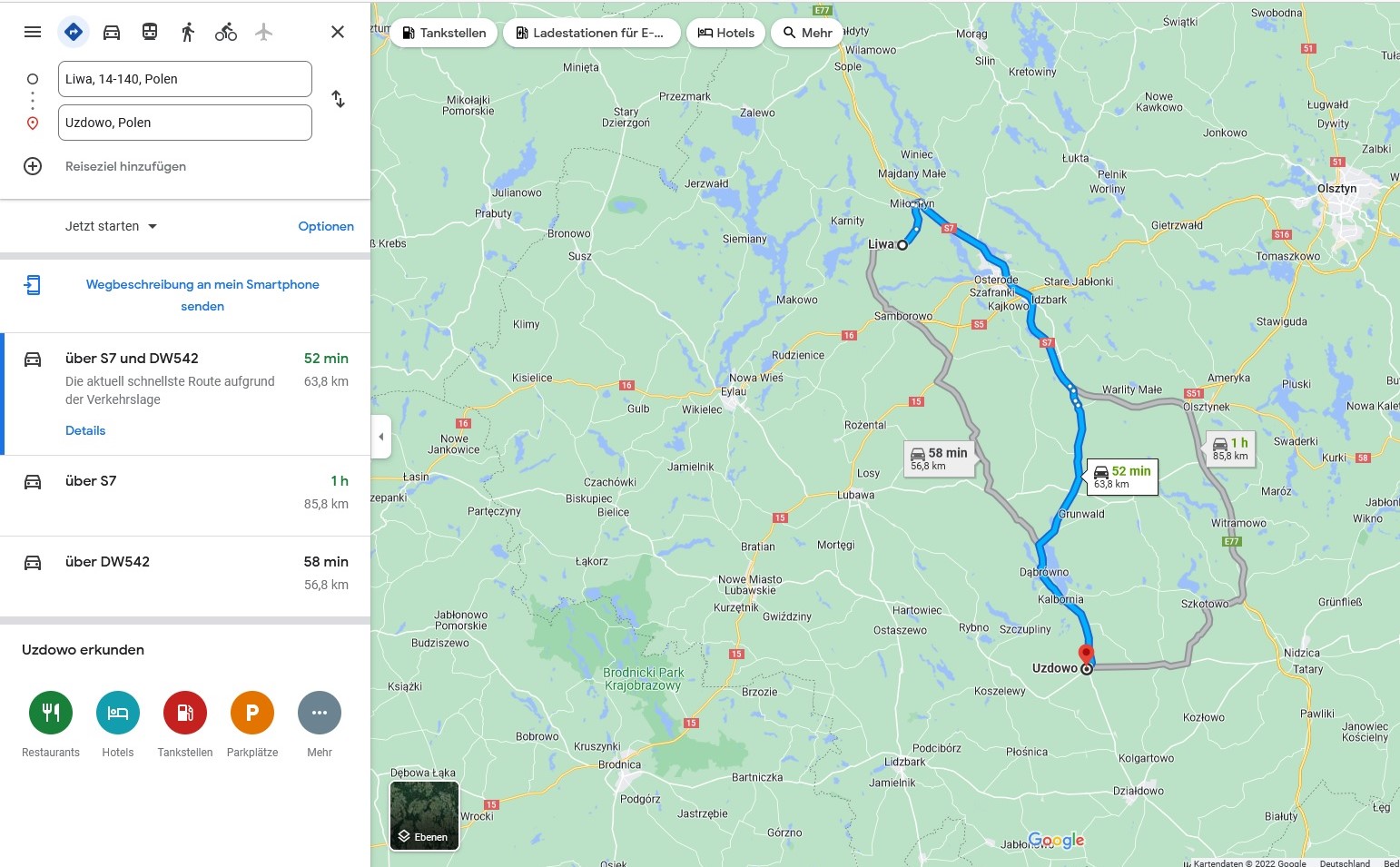Dieser Ortswechsel macht auch plausibler, wie mein Ururgroßvater Franz nach Usdau kommen konnte, denn von Bieberswalde (Liwa) bis nach Usdau (Uzdowo) sind es nach Google Maps gerade einmal 56,8 km.