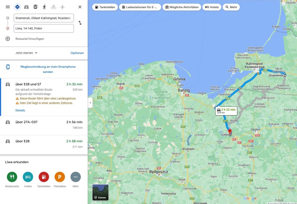 Die Entfernung vom Kreis Wehlau, dem heute russischen Snamensk, nach Bieberswalde, dem heute polnischen Liwa, beträgt laut Google Maps immerhin 188 Kilometer.