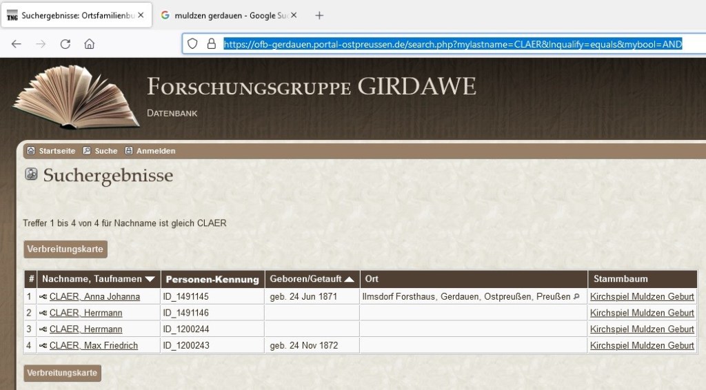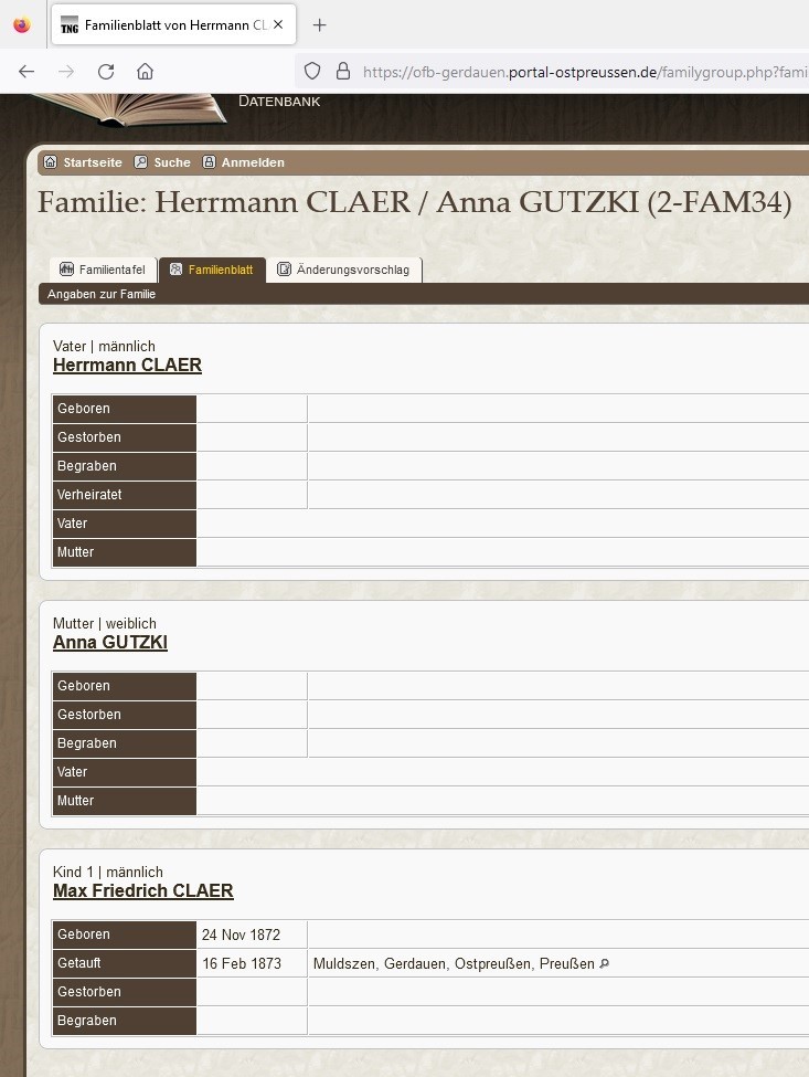 Demnach wurden in Gerdauen, Kirchspiel Muldzen, in den jahren 1871 und 1872 die Kinder Anna Johanna Claer (24.6.1871) und Max Friedrich Claer (24.11.1872) geboren. Die Eltern waren jeweils ein Herrmann Claer und seine Frau Anna Gutzki.