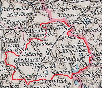 Gerdauen liegt etwas südlich von Wehlau und südöstlich von Königsberg, also ziemlich dicht an Eichenberg/Drusken, wo – wie oben geschildert – die Förster-Familie von Friedrich Clair bis zur Versetzung nach Bieberswalde 1855 gelebt hat. Auch deren frühere Wohnorte Juditten und Corjeiten sowie Friedrichs Geburtsort Ludwigswalde sind nicht weit.
