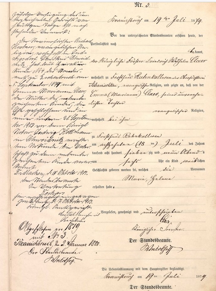 “Der Revierförster Richard Hübner, evangelischer Religion, wohnhaft in Ludwigsdorf, Landkreis Schweidnitz hat laut Heiratsurkunde Nr. 4 des Standesamtes zu Eschenbruch vom 5. September 1879 mit Emma Marianne Claer der Mutter des nebenbezeichneten Kindes, die Ehe geschlossen und in einer unterm 28. September 1903 vor dem königlichen Notar Ludwig Kottman in Schweidnitz errichteten Urkunde die Vaterschaft zu dem nebenbezeichneten Kinde anerkannt
