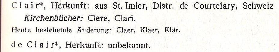 Das heißt, wir können von Clerc oder Clair als ursprünglicher Schreibweise ausgehen, wobei Clerc als Berufsbezeichnung für einen Geistlichen oder jemanden, der lesen und schreiben kann, mir eher noch plausibler erscheint. Wobei natürlich weiterhin auch noch die vornehmlich von meinem Cousin vierten Grades Manfred Claer aus Saarbrücken vehement vertretene Adelstheorie im Rennen ist, wonach unsere Vorfahren in der französischen Schweiz zu den Abkömmlingen des anglonormannischen Adelsgeschlechts der de Clare/v.Claer gehören…