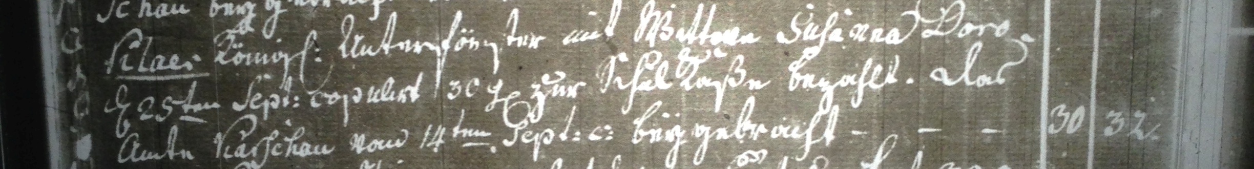 Aus diesen Angaben ergibt sich, dass auch David Clercs Ehefrau Barbe Morel (ebenso wie Davids andere Ehefrau Marguerite Guiot) bereits vor ihrer Ehe mit David verwitwet war. (Die allgemeine Sterblichkeit in den Jahren nach der großen Pest wird groß gewesen sein…) Auch wissen wir jetzt die genauen Zeitpunkte von Davids Eheschließungen. Allerdings war David nach den Datenbankeinträgen aus dem Internet zuerst mit Maguerite Guiot und anschließend mit Barbe Morel verheiratet. Laut der von Manfred beauftragten Genealogin war es genau umgekehrt. Noch wieder anders klingt es bei Dierk Loyal: (David Clerc) „heiratet in Judtschen 1718. Bereits 1724 heiratet die Witwe erneut.“ Richtig hätte es wohl heißen müssen: Bereits 1724 heiratete David Clerc erneut eine Witwe. Festzuhalten ist demnach, dass David wohl zweimal in Judtschen heiratete, 1718 und 1724, und zwar die Witwen Barbe Morel und Marguerite Guiot (die Reihenfolge ist unklar). Das heißt aber entgegen unserer bisherigen Annahme auch: David Clerc war nach 1724 noch am Leben.