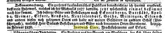 Aufgrund zahlreicher Dokumente, die mir Ralf F. dankenswerterweise zur Verfügung gestellt hat, lässt sich die Linie der Erfurter Claers lückenlos bis zum Feldjäger Johann Friedrich Claer zurückverfolgen, dem Vater des 1802 in Siersleben geborenen überregionalen Erfurter Fuhrunternehmers Christoph Friedrich Claer, dessen Sohn das besagte Lederwarengeschäft gegründet hat. Und jener vor 1776 geborene Johann Friedrich Claer, Sohn des ominösen “hochehrwürdigen Herrn Christian Friedrich Claer” aus Wittiz (wo immer dies gelegen hat), könnte das von uns seit langem gesuchte Verbindungsglied zu “unseren” ostpreußischen Claers darstellen, siehe meinen vorigen Bericht.