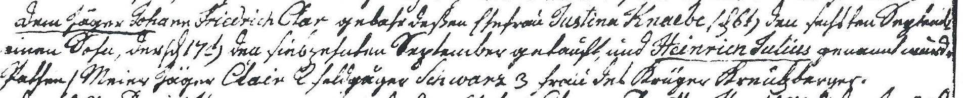 Ich würde es so verstehen, dass am 20.1.1833 ein Hermann August Clair als Sohn von Friedrich Clair, Jäger vermutlich in Metgethen, und Justine Knaebe geboren wurde. Außerdem fungierte Friedrich 1834 als Hochzeitspate des Paares Littmann/Schwill.“