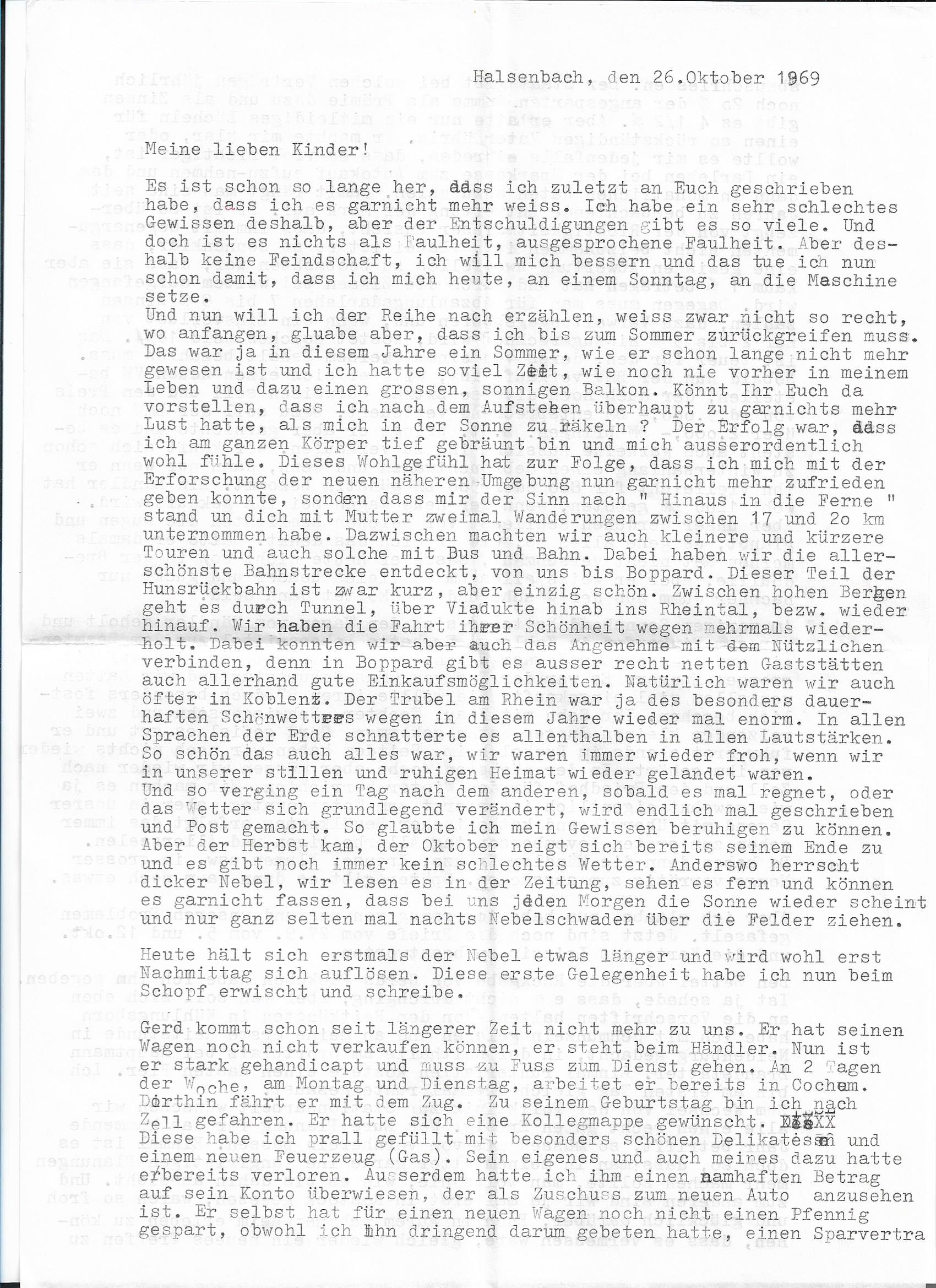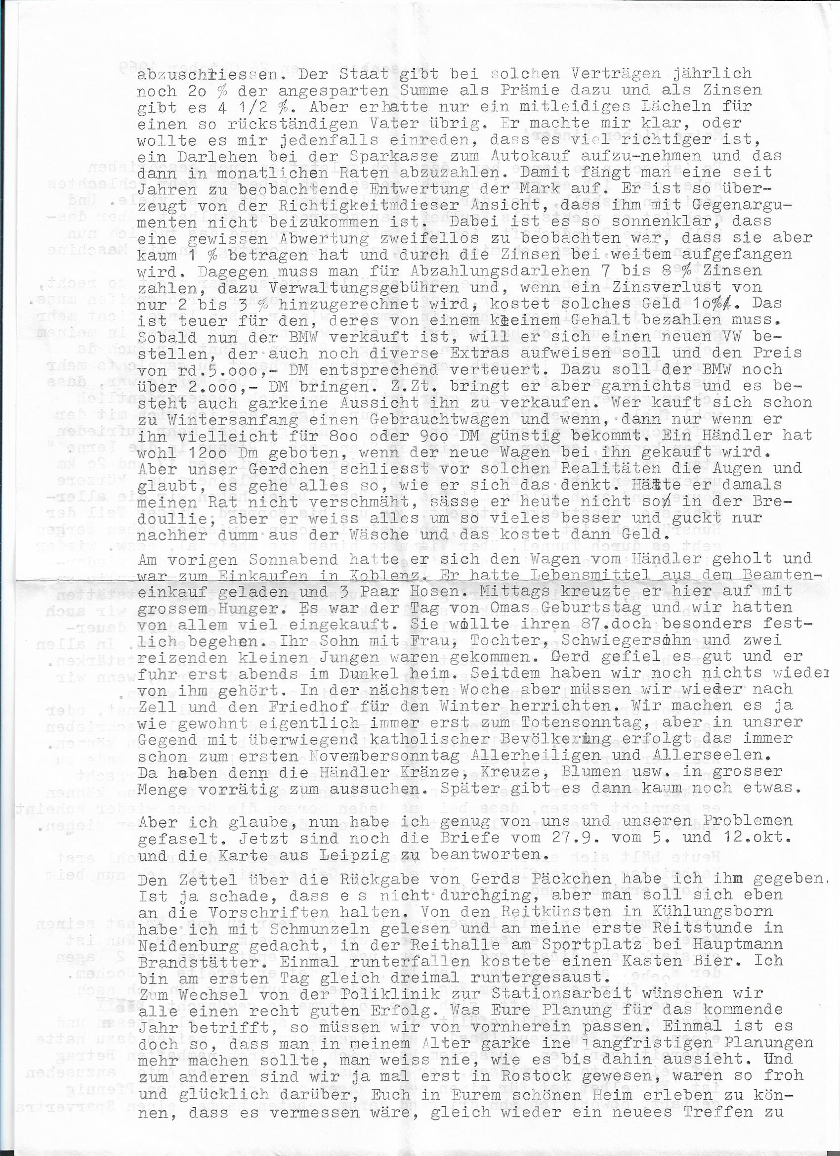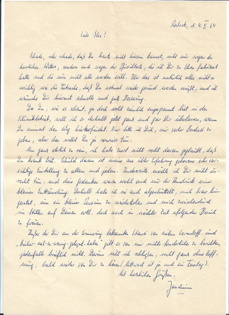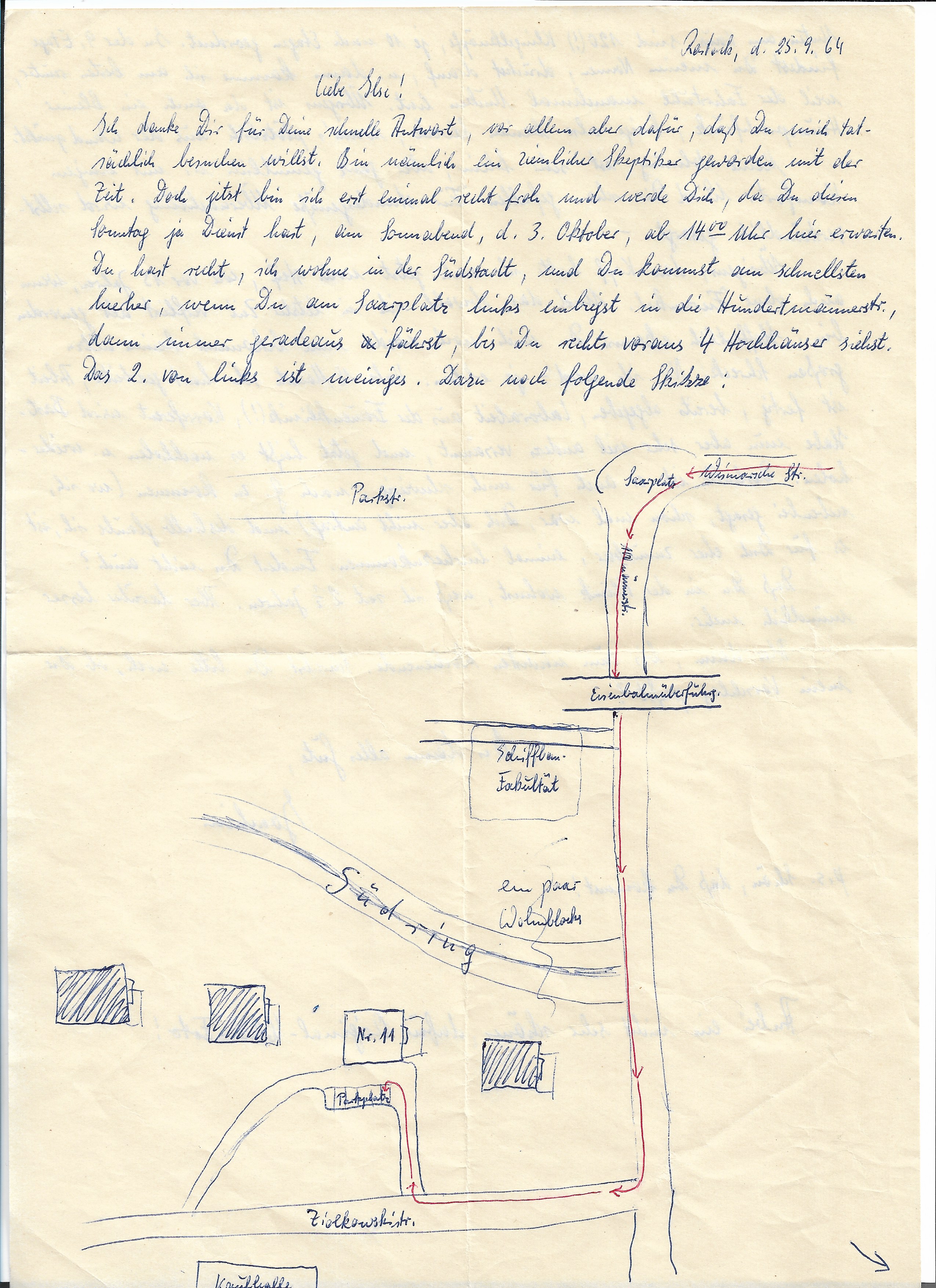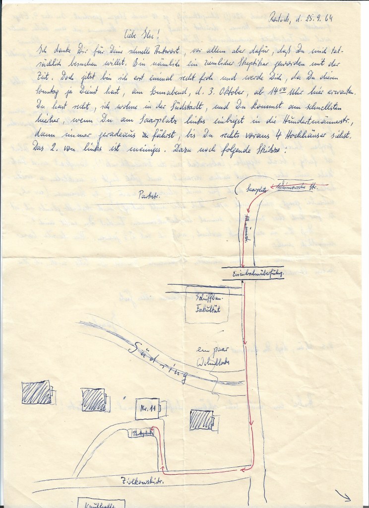 Die folgenden drei Briefe sowie das sich daran anschließende Telegramm (die Jüngeren mögen googeln, was das gewesen ist) aus dem Herbst 1964 habe ich einer Schachtel aus dem Nachlass meiner Eltern mit der vielsagenden Aufschrift „Amouretten“ entnommen, die allerdings ausschließlich Briefe enthält, die mein Vater an meine Mutter geschrieben hat. Deren Antworten sind leider nicht erhalten. Trotz des sehr privaten Charakters dieser Korrespondenz halte ich die Veröffentlichung in dieser Form für relativ unbedenklich, da sie sich – vermutlich auch zeitbedingt – auf einer zumindest verbal sehr sittsamen Ebene abspielt. Hinzu kommt, dass mittlerweile kaum noch involvierte Personen aus jener Zeit am Leben sein dürften.