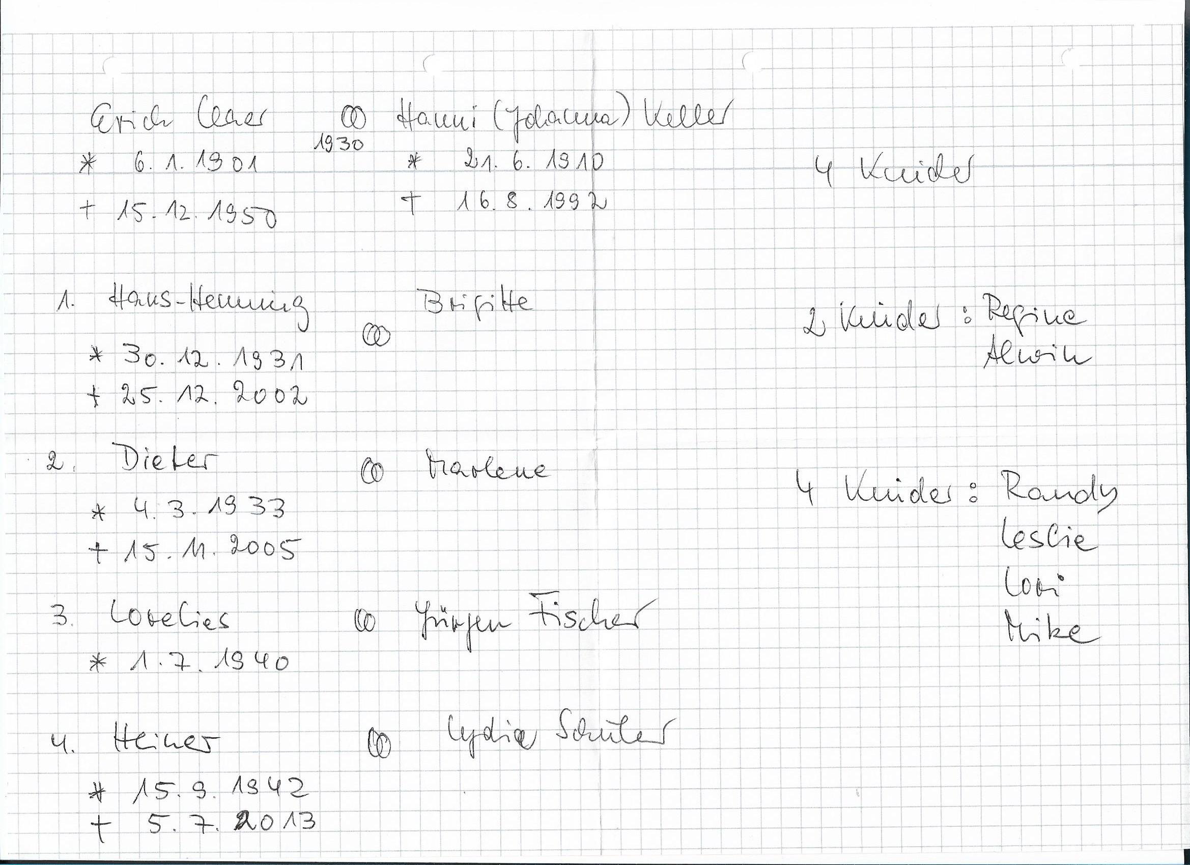 Johann-Ernest Clair und seine Frau Antoinette Katharina Liasere hatten als dritten Sohn einen Friedrich Josef Klair, Botschaftssekretär, geboren 1809 in Fürstenberg, gestorben 1867 in Berlin. Verheiratet war dieser mit einer Agathe Marie Adolfin (1816-1871). Deren gemeinsamer dritter Sohn war ein Ernst Friedrich Karl Klaer, Fuhrunternehmer, geboren 1841 in Fürstenberg, gestorben 1900 in Berlin. (Übrigens wurde dieser zehn Jahre nach Manfred Claers Ururgroßvater, dem Fuhrunternehmer August Hermann /Herrmann August Claer geboren, der vermutlich 1831 zur Welt kam…) Die Ehefrau des Ernst Friedrich Karl Klaer war eine Marie Agnes Pauline Damm (1854-1892). Deren zweiter gemeinsamer Sohn war ein Karl Friedrich Klär, Kaufmann, geboren 1876 in Berlin, gestorben 1939 in Berlin. Dessen Ehefrau hieß Emma Martha Ramin (1878-1949). Der erste gemeinsame Sohn der beiden war schließlich ein Ernst Karl Alexander Klaer, Beamter des Reiches, geboren 1902 in Berlin, gestorben 1950 (Todeserklärung in der Sowjetunion). Dessen Frau war eine Luise Ogossell, geb. 1906. Hier brechen wir aus Diskretionsgründen ab.