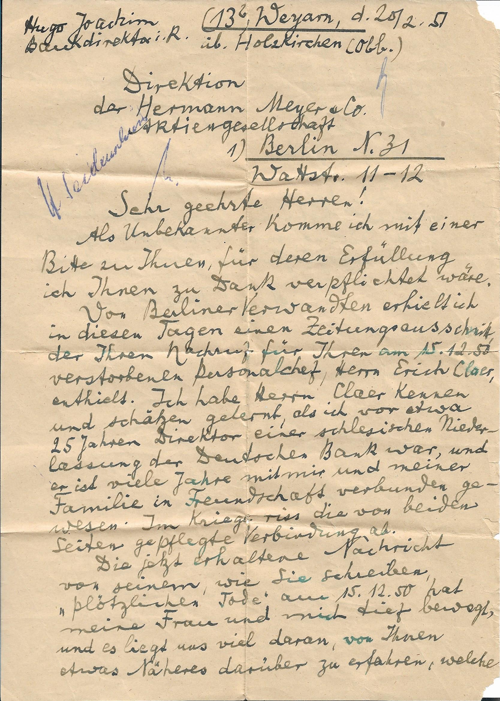 „Verblüfft war ich aber über die Aussage, dass es mal ein „von“ in der Familie gegeben haben soll, denn die selbe Aussage gibt es auch in unserer Familie und stammt wohl von Franz Richard Claer an meinen Großvater Arnold, dort ging es wohl um ein Rittergut.“