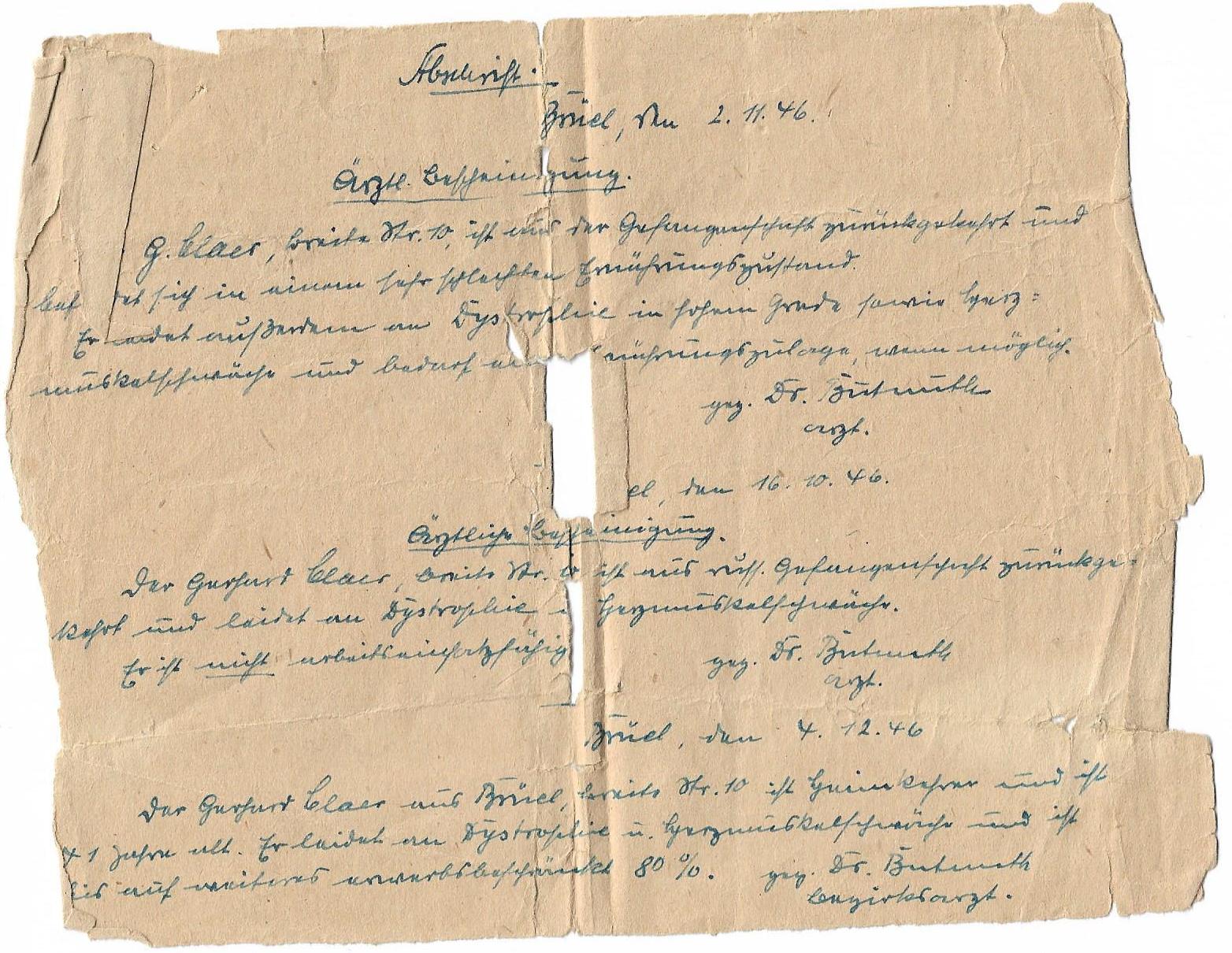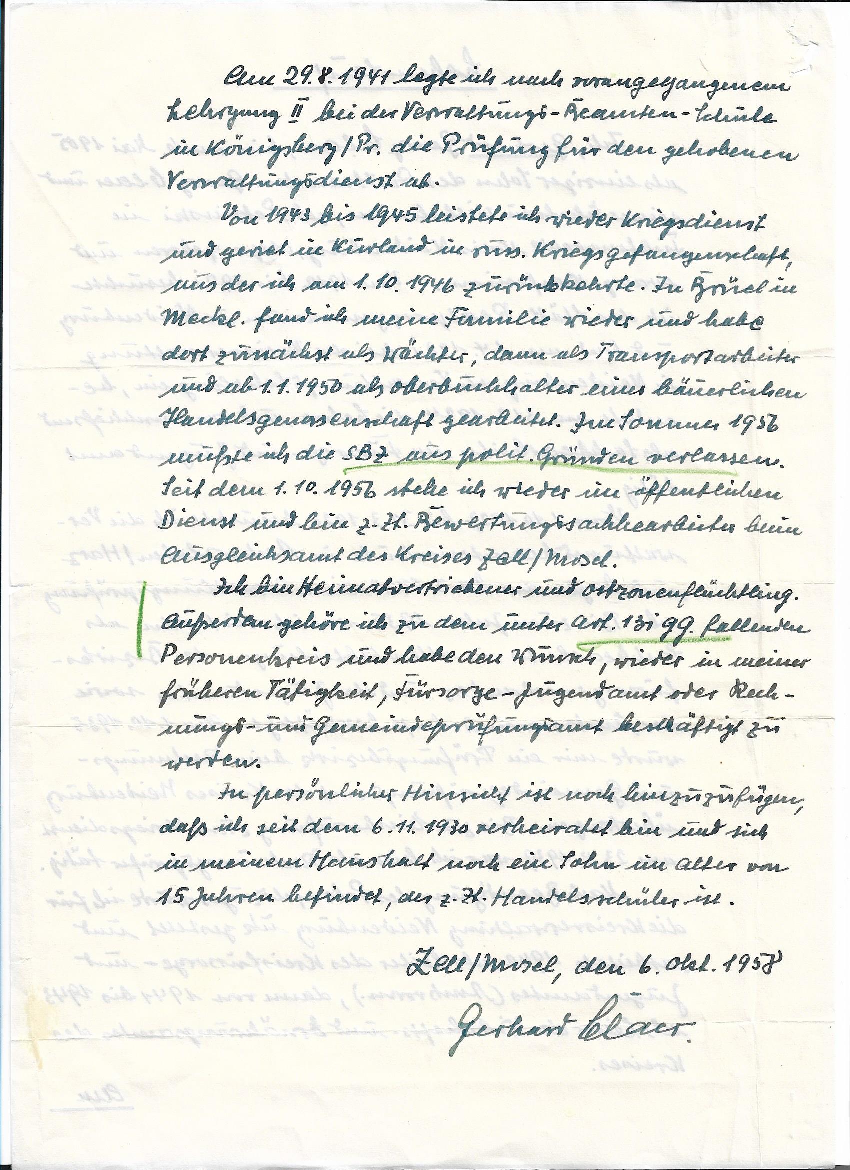 Ausgeschlossen ist, dass es Franz Claer wie seinem Großvater erging, dessen Kinder um 1800 von Kirchenbuchschreibern nach Belieben heute so und morgen anders geschrieben wurden. Franz Claer konnte als Postbeamter sehr wohl hinlänglich lesen und schreiben und dürfte nicht zuletzt aus berufsbedingter Pingeligkeit (und diese Eigenschaft hat sich nach meiner Kenntnis und Erfahrung direkt auf meinen Großvater Gerhard, meinen Vater Joachim, meinen Onkel Gerd und nicht zuletzt auf mich selbst vererbt!) genau gewusst haben, wie sein Name geschrieben werden sollte. Aber wenn er die latinisierte Schreibweise mit ae selbst gewählt hätte, warum dann das i-Tüpfelchen in der Unterschrift bei zumindest seinem Enkel und zunächst zweien, später noch einem seiner Urenkel. War es eine Protesthaltung gegen die Latinisierung der Namensschreibweise durch den Großvater? Oder vielmehr eine Protesthaltung gegen eine dem Großvater aufgezwungene Latinisierung des Familiennamens, die in der Familie über drei Generation weitergegeben wurde?