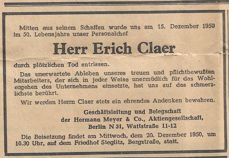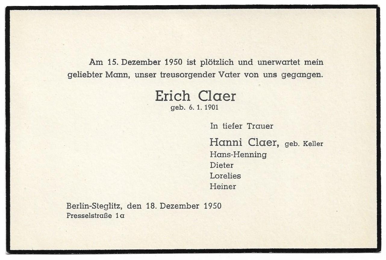 – 1901 Geburt Erich Otto Georg Clär (geschrieben mit ä, die eigenhändige Unterschrift des Vaters Otto Albert lautete aber Claer mit ae)