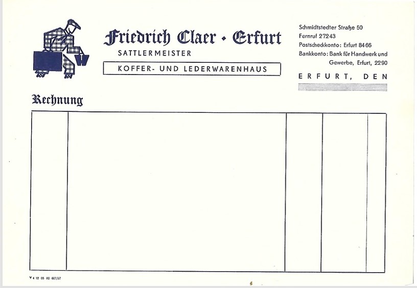 Gerade hatte ich in meinen letzten “Forschungsberichten” noch die Claers aus Thüringen behandelt und mit Bedauern festgestellt, dass sich zwar noch bis in die Nachkriegszeit ein “Lederwarengeschäft Friedrich Claer” in Erfurt nachweisen lässt, aber mittlerweile leider keine Namensträger mehr dort auffindbar sind. Doch nun hat sich tatsächlich ein direkter Nachkomme der Erfurter Claers bei mir gemeldet! Der 72-jährige Ralf F. aus Erfurt ist der Sohn von Johanna F., geb. Claer (30.6.1926 – 30.5.2012), und der Enkelsohn des Sattlermeisters Friedrich Wilhelm Claer (1895-1959), des letzten Betreibers des Erfurter “Lederwarengeschäfts Friedrich Claer”. Ralf F. hat detaillierte Kindheitserinnerungen an seinen Großvater und beschreibt diesen als stets sehr fröhlichen, humorvollen und lebenslustigen Mann, der mitunter auch mit der Kundschaft seines Ladens seine Possen trieb. Friedrich Wilhelm Claer (1895-1959) führte in dritter Generation das von seinem Großvater Friedrich Wilhelm Heinrich Claer (geb. 1825) gegründete Lederwarengeschäft. Sein Werbeslogan lautete: “Ob Koffer, Tasche, Necessaire – es bleibt dabei: Du gehst zu Claer”.