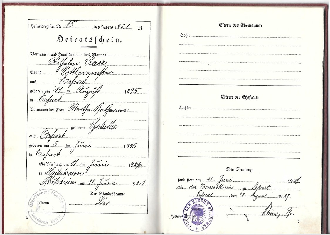 Heiratsschein Friedrich Wilhelm Claer von 1921