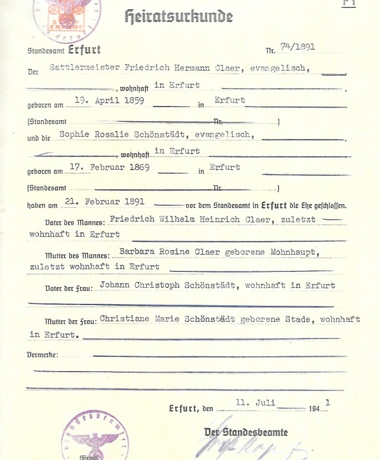 Heiratsurkunde Friedrich Hermann Claer von 1891