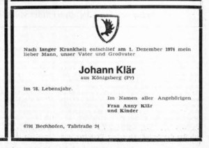 (http://archiv.preussische-allgemeine.de/1974/1974_12_07_49.pdf) noch einen weiteren Klär aus Königsberg finden – auch er mit dem Vornamen Johann!