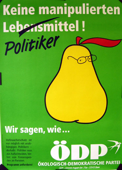 Als nächstes galt es, die Plakate aufzuhängen, die von der Parteizentrale geschickt worden waren. Sehr gute Plakate waren das (siehe Abbildung), originell, aussagekräftig und ohne Kandidaten-Köpfe. Der Arzt mit dem Porsche bot sich gleich an, die halbe Stadt zu behängen, und ich sollte ihm dabei helfen. Alle waren froh und dankbar, denn in früheren Wahlkämpfen musste das Aufhängen der Plakate auf den schweren Holztafeln ohne Auto wohl eine ziemliche Plackerei gewesen sein. Der Porsche-Arzt war so geschickt beim Befestigen und Verdrahten der Holztafeln an den Laternenmasten, dass ich ihm eigentlich nur Gesellschaft zu leisten brauchte. Allerdings nahm kein Mensch von unseren Plakaten auch nur die geringste Notiz. Bis plötzlich ein Mann mit lauten “Hehe”- Rufen auf den Stapel ÖDP-Plakate auf der Rückbank des Porsches zeigte. So schien es mir jedenfalls. Ein ökologischer Bruder im Geiste? Nein, weit gefehlt. Nach einigen Augenblicken wurde mir klar, dass es ihm in Wahrheit um den roten Porsche ging. Etliche Minuten lang fachsimpelte er mit dem Porsche-Arzt über allerhand technische Details des Pracht-Schlittens.